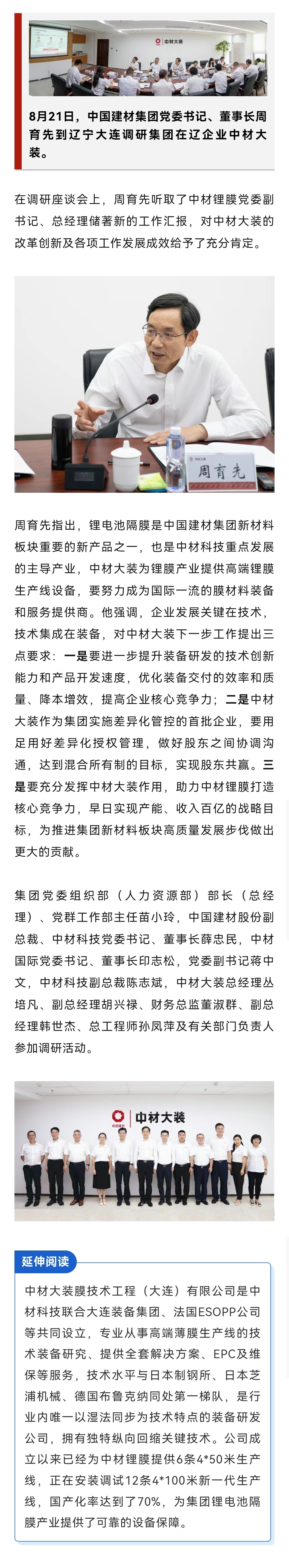 8月21日,中國建材集團黨委書記、董事長周育先到遼寧大連調研集團在遼企業中材大裝。