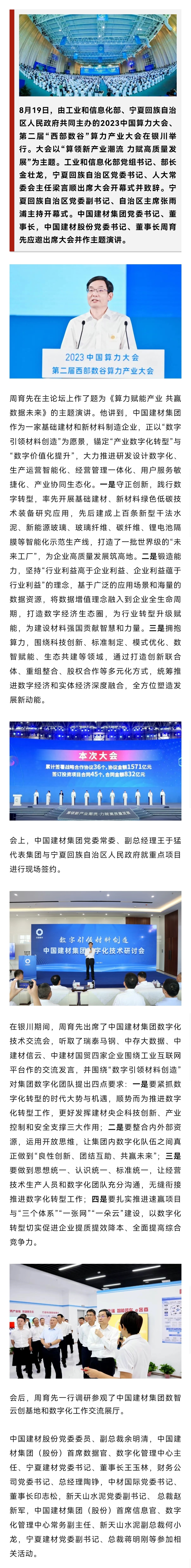 8月19日,由工業和信息化部、寧夏回族自治區人民政府共同主辦的2023中國算力大會、第二屆“西部數谷”算力產業大會在銀川舉行。大會以“算領新產業潮流 力賦高質量發展”為主題。工業和信息化部黨組書記、部長金壯龍,寧夏回族自治區黨委書記、人大常委會主任梁言順出席大會開幕式并致辭。寧夏回族自治區黨委副書記、自治區主席張雨浦主持開幕式。中國建材集團黨委書記、董事長,中國建材股份黨委書記、董事長周育先應邀出席大會并作主題演講。