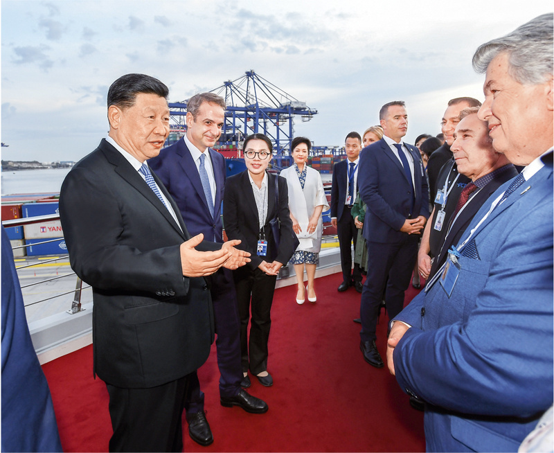 當地時間2019年11月11日,國家主席習近平和夫人彭麗媛在希臘總理米佐塔基斯夫婦陪同下,共同參觀中遠海運比雷埃夫斯港項目。這是習近平與當地員工代表親切交談,詢問他們的工作和生活情況。 新華社記者 謝環馳/攝